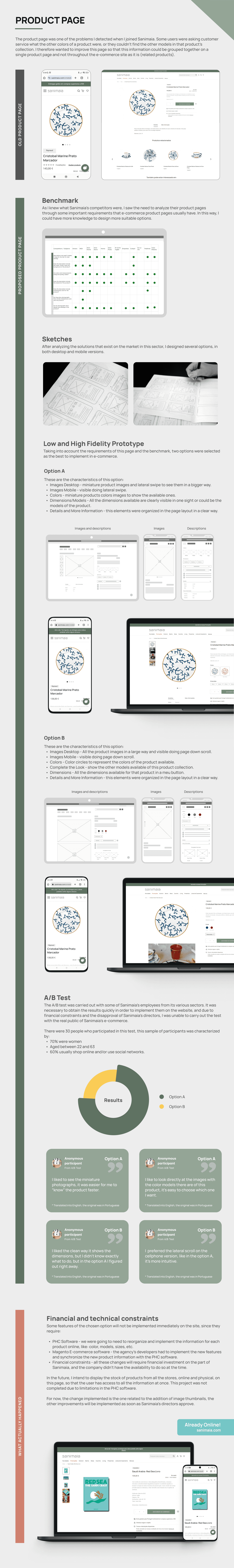 Sanimaia is a small Portuguese company that is constantly looking to grow, expand its market and retain many loyal customers. It sells decorative, bathroom and construction materials from renowned international and national brands. In 2022, the company only had physical stores in Porto, but wanted to expand its market to reach customers all over the country. The first step was to hire an e-commerce agency to create an online store, the second step was to create a e-commerce team and hire someone who would take on the challenge of helping to manage and improve the e-commerce experience. That's when I was promoted to in-house designer and e-commerce manager for the company.